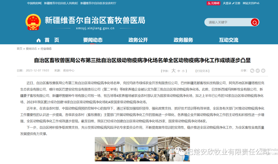 2023年12月,自治區(qū)畜牧獸醫(yī)局第三批自治區(qū)級動物疫病凈化場名單公布,巴楚公司第二羊場獲此殊榮。三年多來,在農(nóng)業(yè)農(nóng)村部、中國動物疫病預(yù)防控制中心的指導(dǎo)下,巴楚安欣通過采取加強組織管理、爭取政策支持、抓好技術(shù)培訓(xùn)等有效舉措,公司養(yǎng)殖場區(qū)對動物疫病凈化工作的措施進一步細化,出色完成動物疫病凈化工作,提升全公司動物疫病防控整體水平,為全區(qū)動物疫病凈化工作積累成功經(jīng)驗。安欣牧業(yè)必將不斷提高宣傳培訓(xùn)的實效性,穩(wěn)步推進全區(qū)動物疫病凈化工作,為全區(qū)畜物業(yè)高質(zhì)量發(fā)展提供有力支撐。